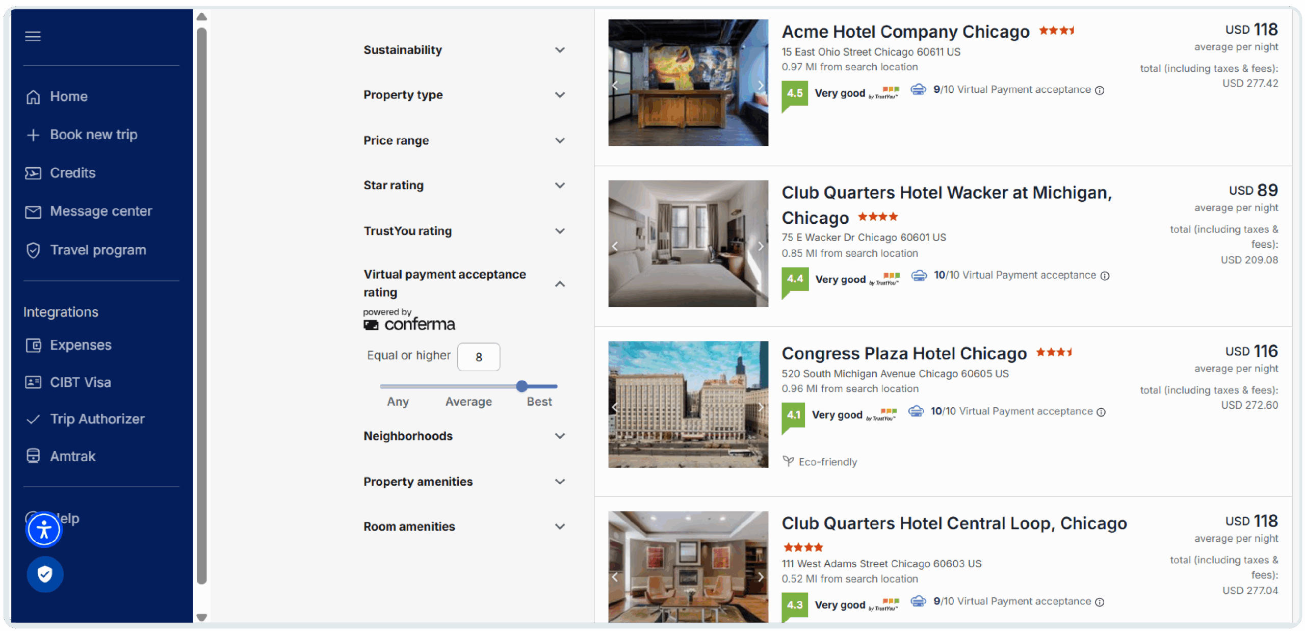 Finden und wählen Sie schnell Hotels aus, die virtuelle Zahlungen konsequent und fachkundig unterstützen, mit unserem neuen Rating zur Akzeptanz virtueller Zahlungen. Sehen Sie die Bewertung auf einen Blick auf den Hotelresultats- und Preis-Seiten oder filtern Sie Ihre Suche nach Bewertung, um Objekte mit höherer Zuverlässigkeit bei virtuellen Zahlungen zu priorisieren.