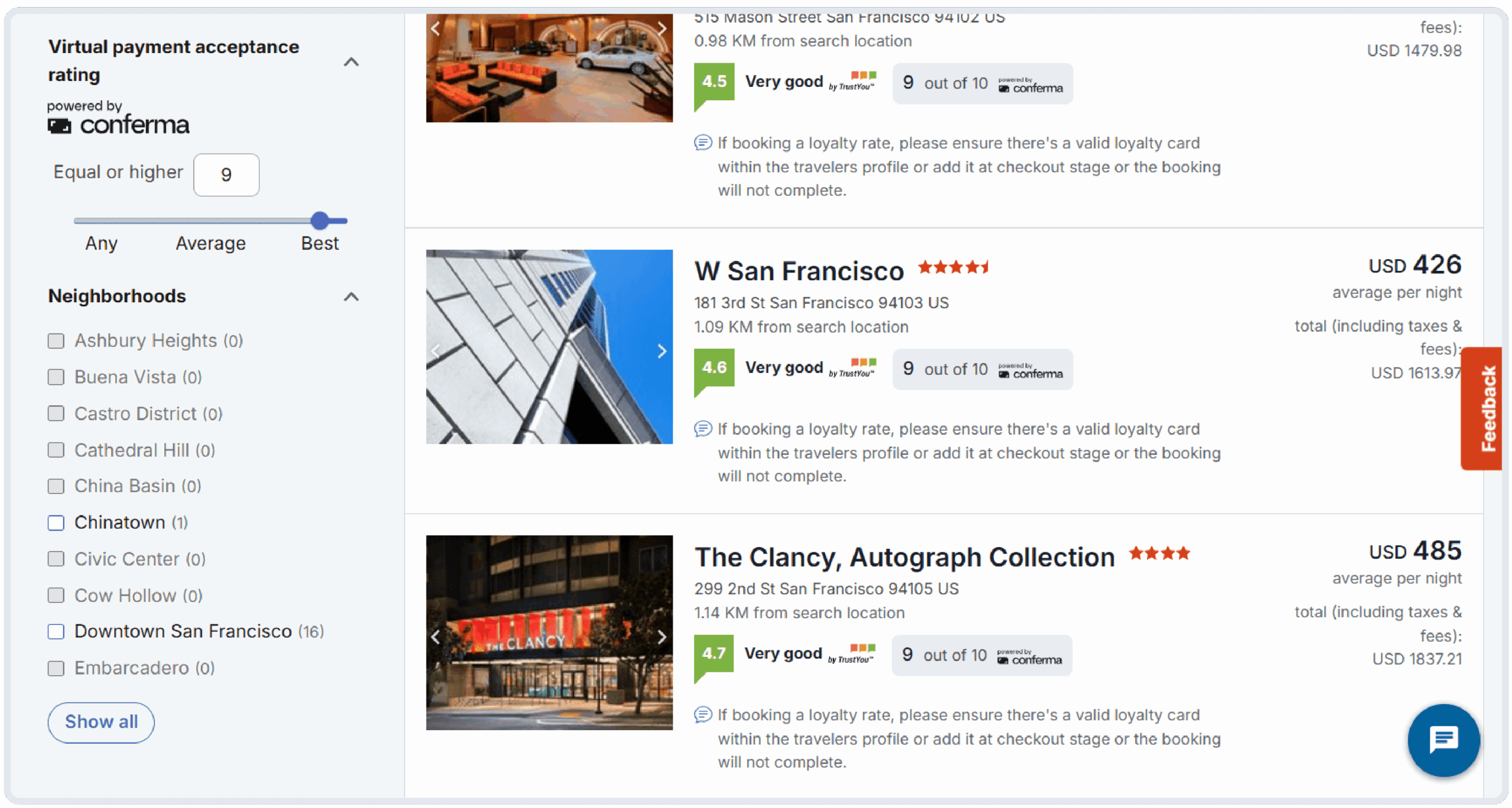Encuentre y seleccione rápidamente hoteles que admitan pagos virtuales de manera consistente y experta con nuestra nueva calificación de aceptación de pagos virtuales. Vea la calificación de un vistazo en las páginas de resultados y tarifas de los hoteles o filtre su búsqueda por calificación para priorizar las propiedades con mayor confiabilidad de pago virtual.