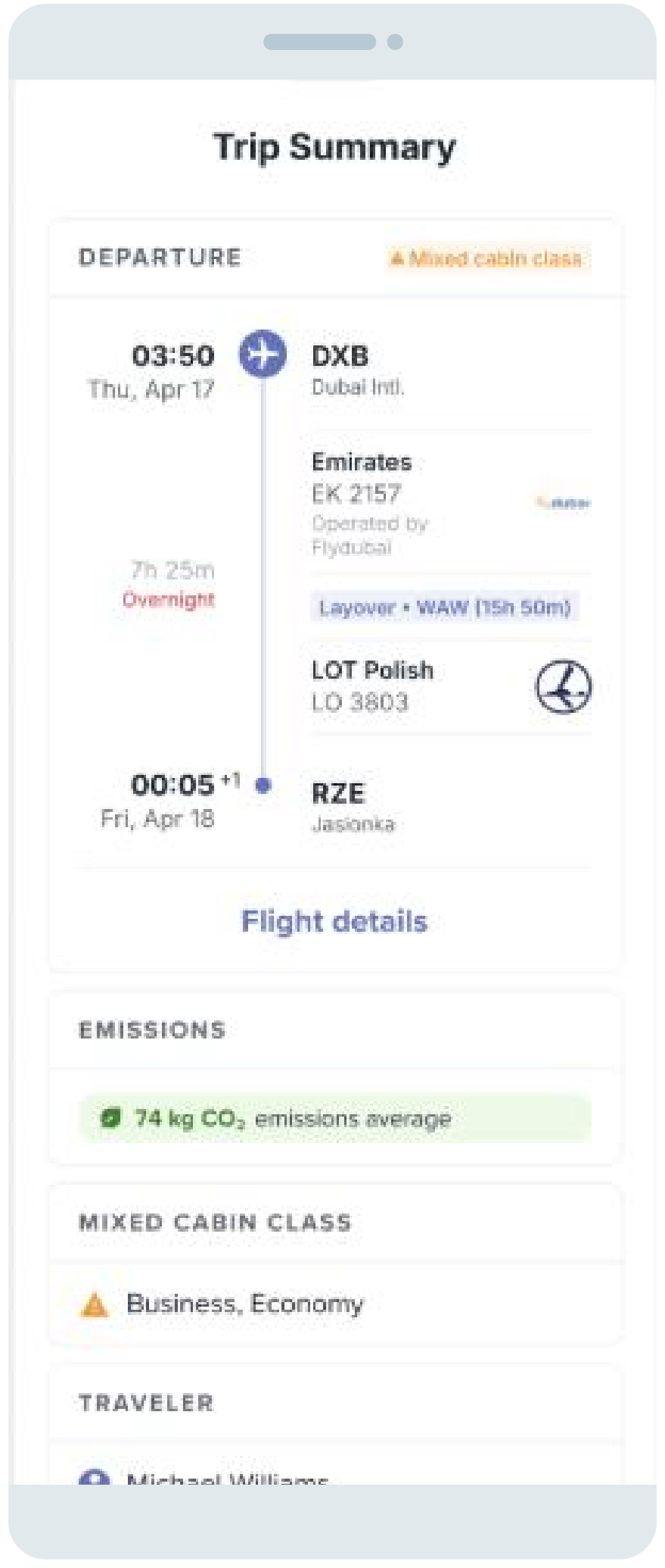 View CO2 emissions estimates for nearly all flights in your search results. The estimate is visible next to the class of service and rules for baggage. Calculations are based on the Travel Impact Model (TIM).
